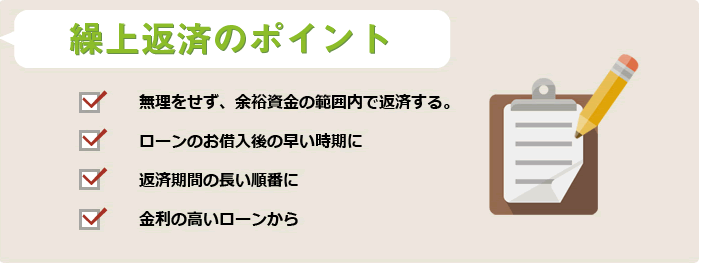 毎月の返済やボーナス返済とは別に、お借入金額の一部または全額を前倒しして返済することを繰上返済といいます。